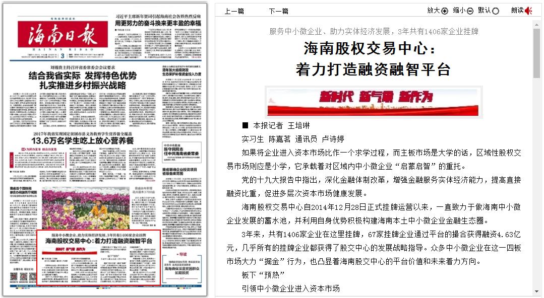 1月3日,海南日?qǐng)?bào)頭版刊發(fā)報(bào)道——《海南股權(quán)交易中心:著力打造融資融智平臺(tái)》。報(bào)道回顧了股交中心成立三年來,在引領(lǐng)中小微企業(yè)進(jìn)入資本市場(chǎng)、融資融智加速中小微企業(yè)發(fā)展、塑造中小微企業(yè)金融品牌等方面所走過的...