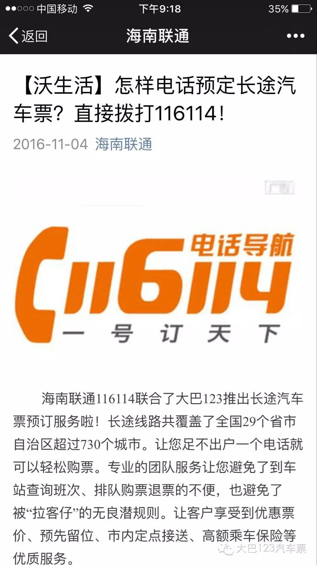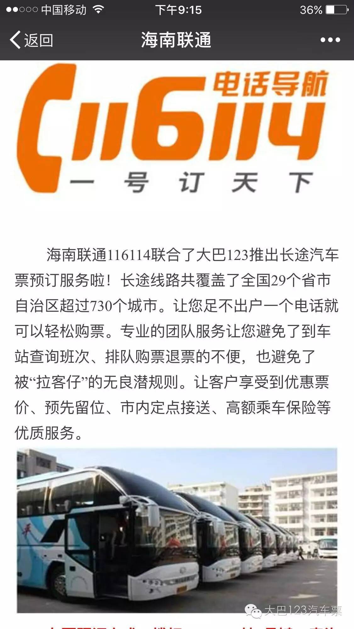 如今,大巴123汽車票與海南聯(lián)通116114合作了,不僅可以在微信上購買汽車票,也可以用電話預定汽車票。