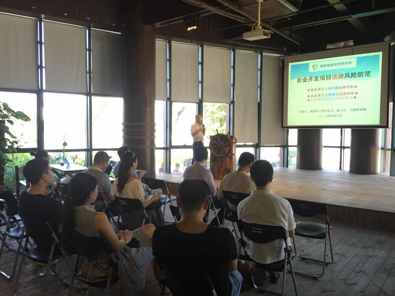 本次培訓(xùn)主題為“農(nóng)業(yè)開發(fā)項(xiàng)目法律風(fēng)險防范”,肖律師從農(nóng)業(yè)項(xiàng)目土地問題法律評析、農(nóng)業(yè)項(xiàng)目眾籌模式法律評析和農(nóng)業(yè)項(xiàng)目投資評估風(fēng)險管理三部分展開培訓(xùn),開頭詳細(xì)介紹了與農(nóng)業(yè)項(xiàng)目開發(fā)相關(guān)的土地法律法規(guī)和土地使用法律風(fēng)險,并伴以生動翔實(shí)的案例為在場企業(yè)代表作了說明。緊接著,肖律師從眾籌的平臺型、消費(fèi)型和權(quán)益型三大類商業(yè)模式講解農(nóng)業(yè)眾籌,闡述了農(nóng)業(yè)大投資、長周期、高風(fēng)險的行業(yè)屬性。最后,肖律師從農(nóng)業(yè)項(xiàng)目投資管理風(fēng)險特征、風(fēng)險類型和防范對策幫助企業(yè)詳細(xì)了解國家政策傾斜、資金投入和銀行信貸扶持對農(nóng)企發(fā)展的重要性。