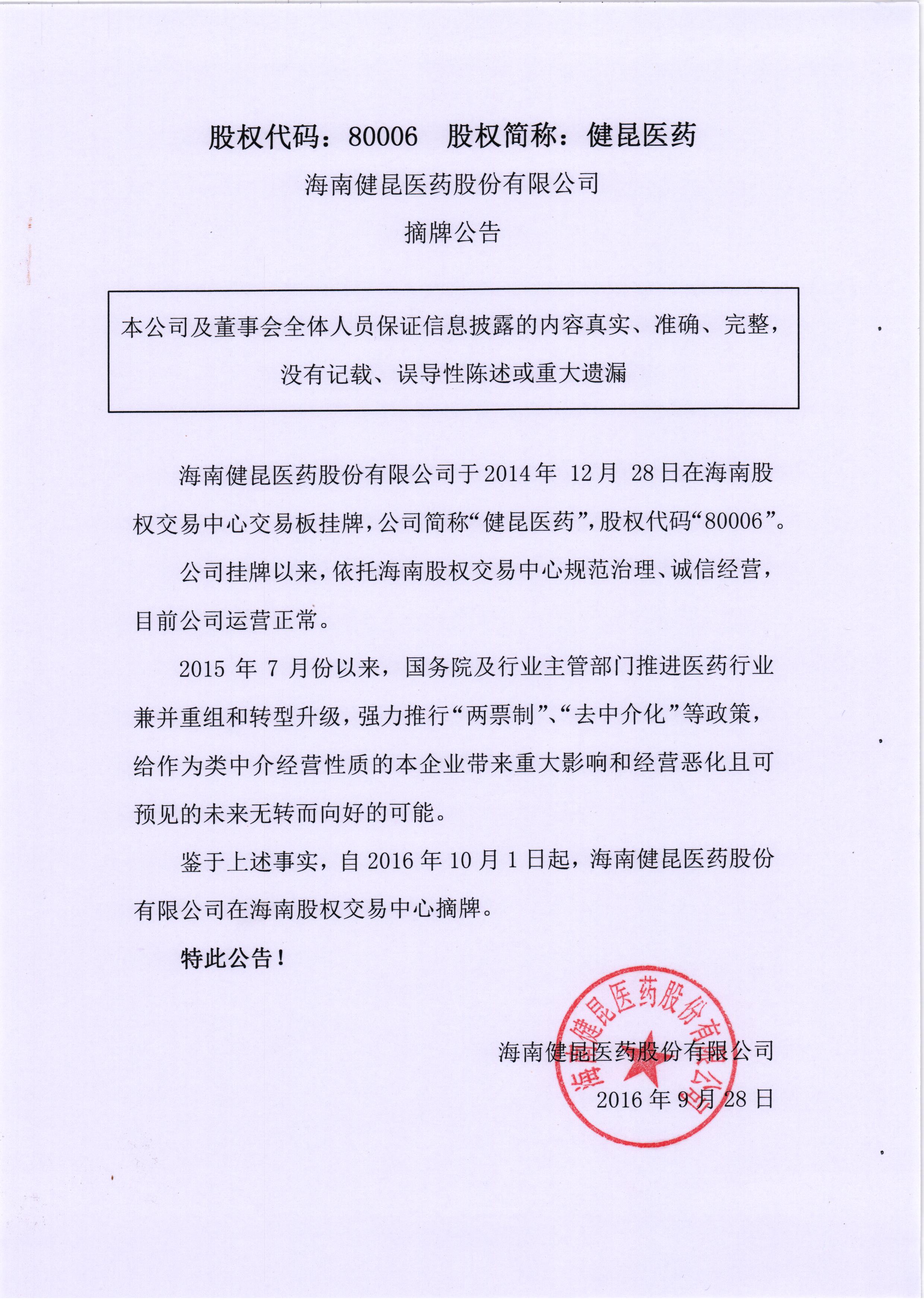 80006 健昆醫(yī)藥:海南健昆醫(yī)藥股份有限公司摘牌公告