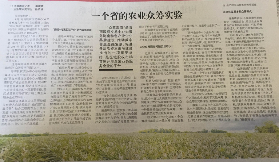 “眾籌海南”作為海南股權(quán)交易中心推動海南特色產(chǎn)業(yè)發(fā)展的一項重要舉措,持續(xù)受到媒體關(guān)注。最近,面向全國公開發(fā)行的具有鮮明法治特色的中央級主流政經(jīng)周報——《法治周末》以半版篇幅刊發(fā)了《一個省的農(nóng)業(yè)眾籌實驗》專題文章。