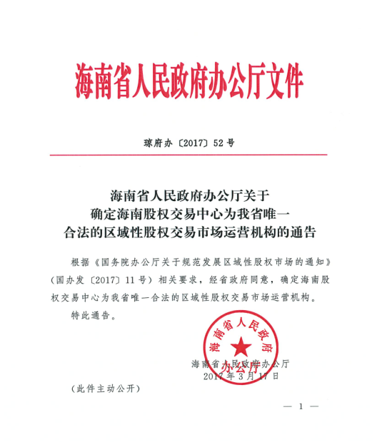海南省人民政府辦公廳關(guān)于確定海南股權(quán)交易中心為我省唯一合法的區(qū)域性股權(quán)交易市場(chǎng)運(yùn)營(yíng)機(jī)構(gòu)的通告