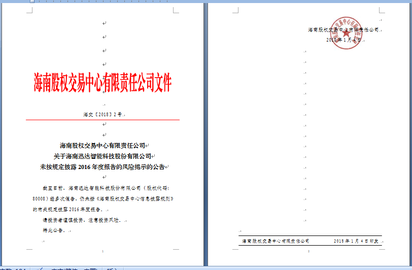 海南股權(quán)交易中心有限責(zé)任公司關(guān)于海南迅達(dá)智能科技股份有限公司未按規(guī)定披露2016年度報(bào)告的風(fēng)險揭示的公告