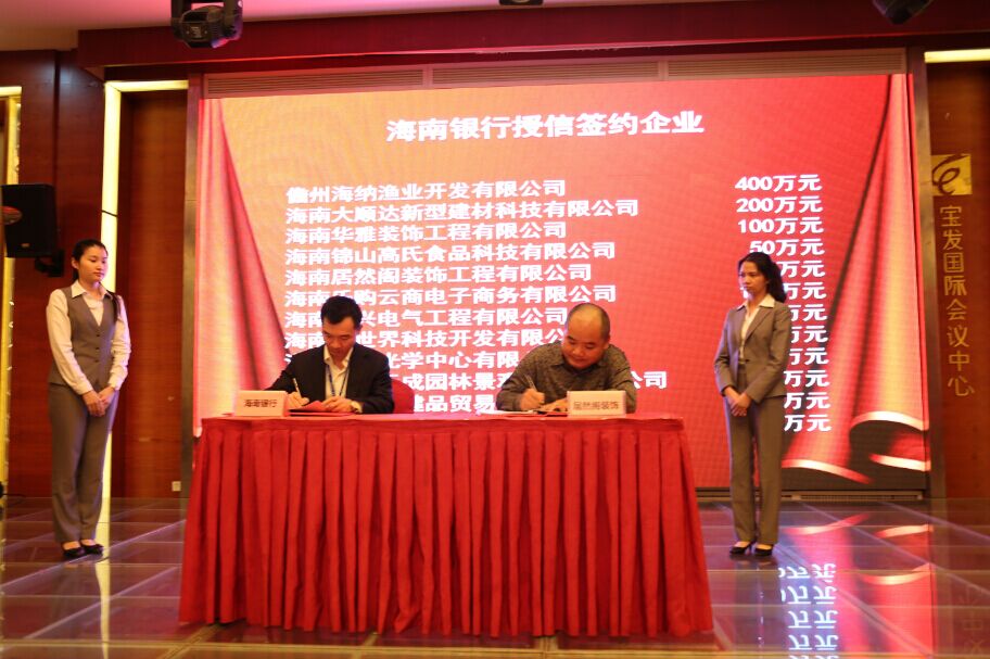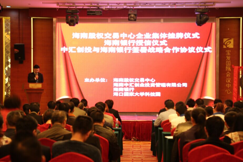 1月15日,海南股權(quán)交易中心企業(yè)集體掛牌暨銀行授信簽約儀式,在??趯毎l(fā)幸福酒店舉行。本次活動由海南股權(quán)交易中心、海南中匯創(chuàng)業(yè)投資管理有限公司、海南銀行、??趪掖髮W(xué)科技園聯(lián)合主辦。37家企業(yè)現(xiàn)場集體掛牌海南股權(quán)交易中心,其中12家企業(yè)獲得海南銀行合計額度2100萬元的授信。