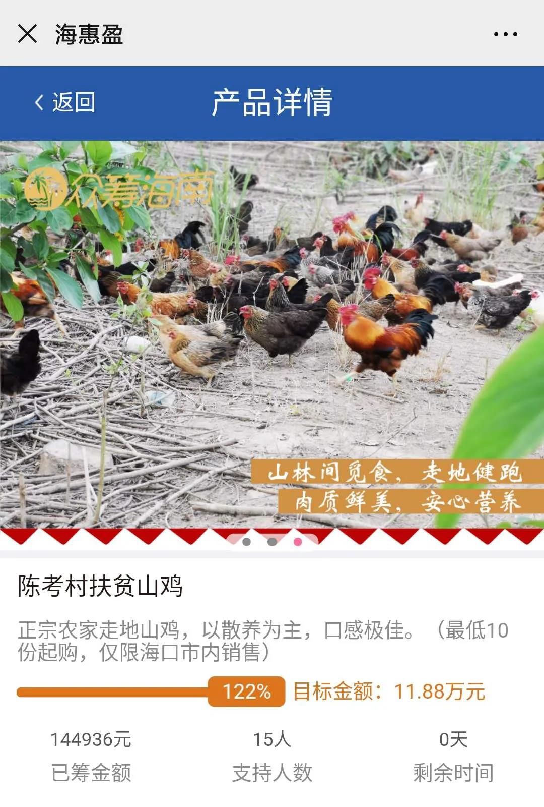 為了持續(xù)幫助海南省樂東縣大安鎮(zhèn)陳考村村民打開當?shù)貎?yōu)質(zhì)農(nóng)產(chǎn)品的銷路,在海南證監(jiān)局的指導(dǎo)下,海南股交借助“互聯(lián)網(wǎng)+農(nóng)業(yè)眾籌”的形式,再次幫助陳考村村民享受“互聯(lián)網(wǎng)+”的發(fā)展紅利。海南股交旗下綜合金融服務(wù)平臺“?;萦庇?月7日推出“陳考村扶貧山雞”項目,開啟新一期的扶貧眾籌活動,截止4月27日,該項目完成率122%,眾籌金額14.4萬余元。