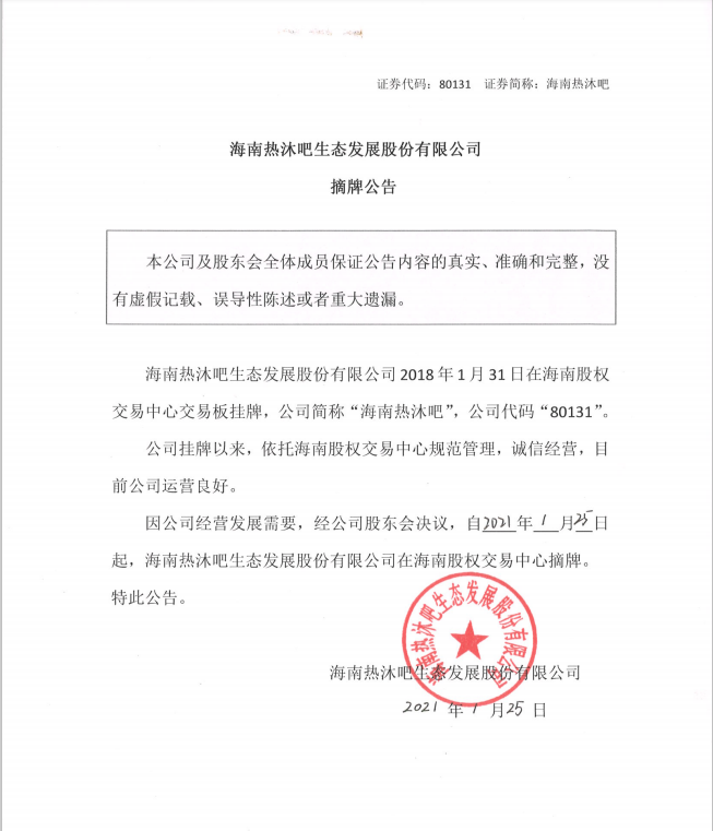 80131海南熱沐吧 海南熱沐吧生態(tài)發(fā)展股份有限公司摘牌公告