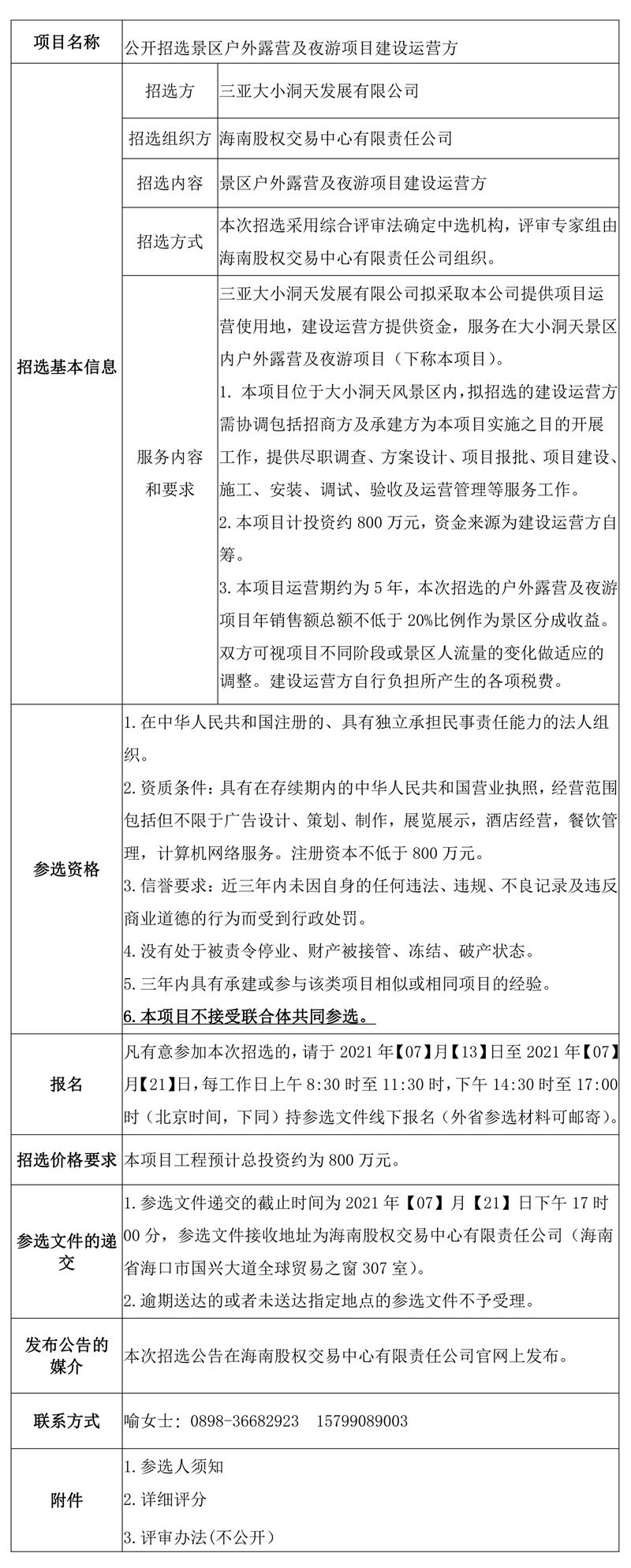 根據(jù)相關(guān)法律法規(guī),受委托,海南股權(quán)交易中心有限責(zé)任公司公開招選景區(qū)戶外露營及夜游項目建設(shè)運營方,為三亞大小洞天景區(qū)的戶外露營及夜游項目提供盡職調(diào)查、方案設(shè)計、項目報批、項目建設(shè)、施工、安裝、調(diào)試、驗收及運營管理等服務(wù)工作。歡迎符合條件的機構(gòu)遵照本公告的有關(guān)規(guī)定報名參加,現(xiàn)將有關(guān)事項公告如下: