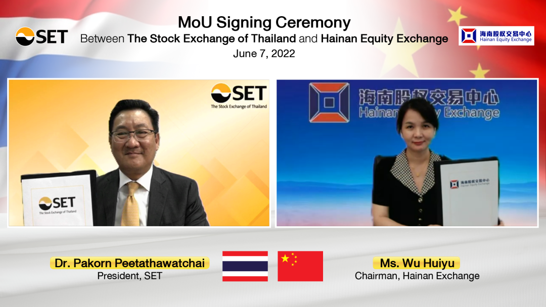 近日,海南股權(quán)交易中心與泰國證券交易所舉辦合作諒解備忘錄線上簽約儀式。海南股權(quán)交易中心董事長吳惠玉、泰國證券交易所總裁帕功·比達(dá)塔瓦猜(Pakorn Peetathawatchai)共同簽署《海南股權(quán)交易中心與泰國證券交易所合作諒解備忘錄》并分別致辭。備忘錄的簽署標(biāo)志雙方在今后共同建立長期、建設(shè)性合作伙伴關(guān)系上達(dá)成共識。