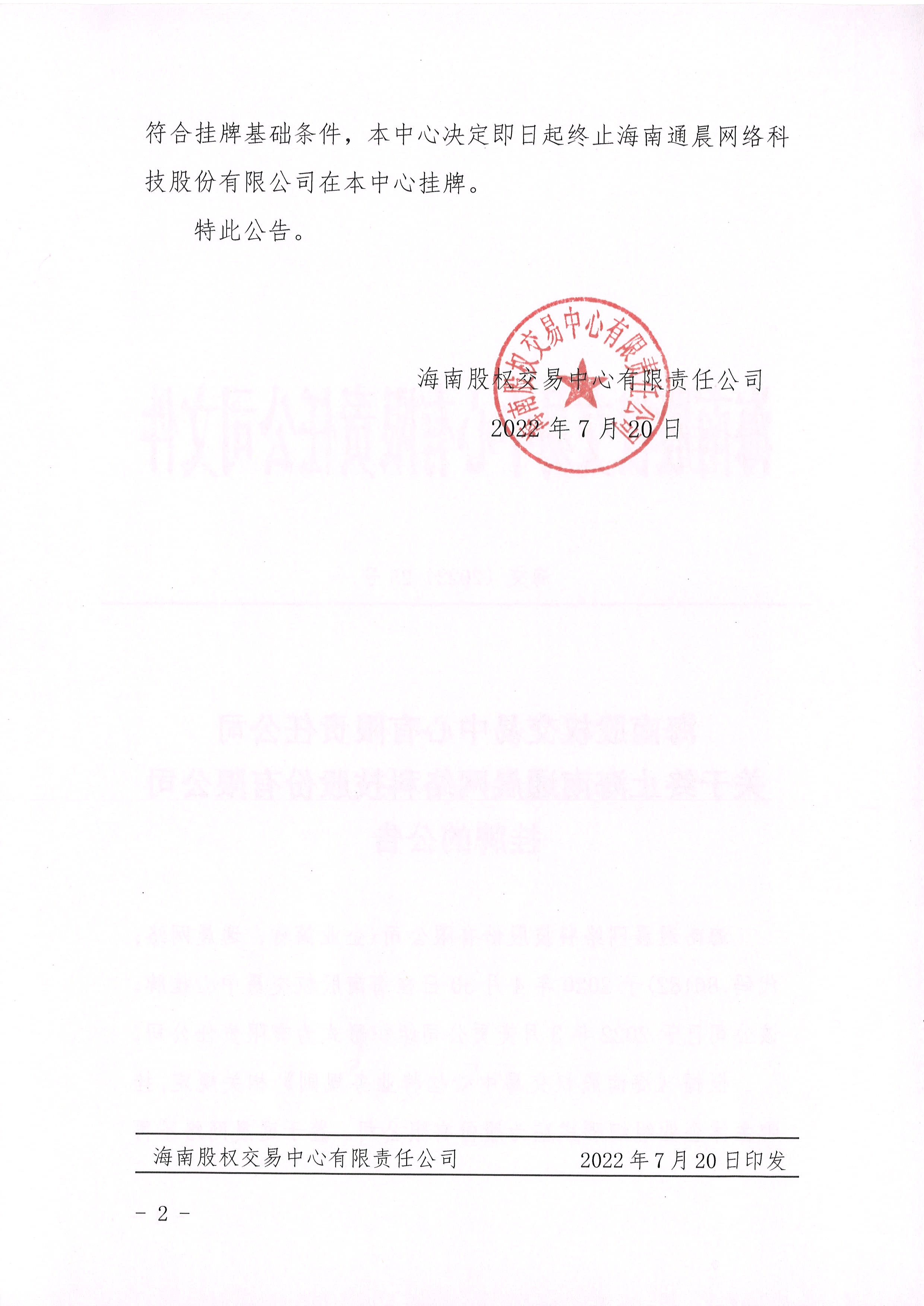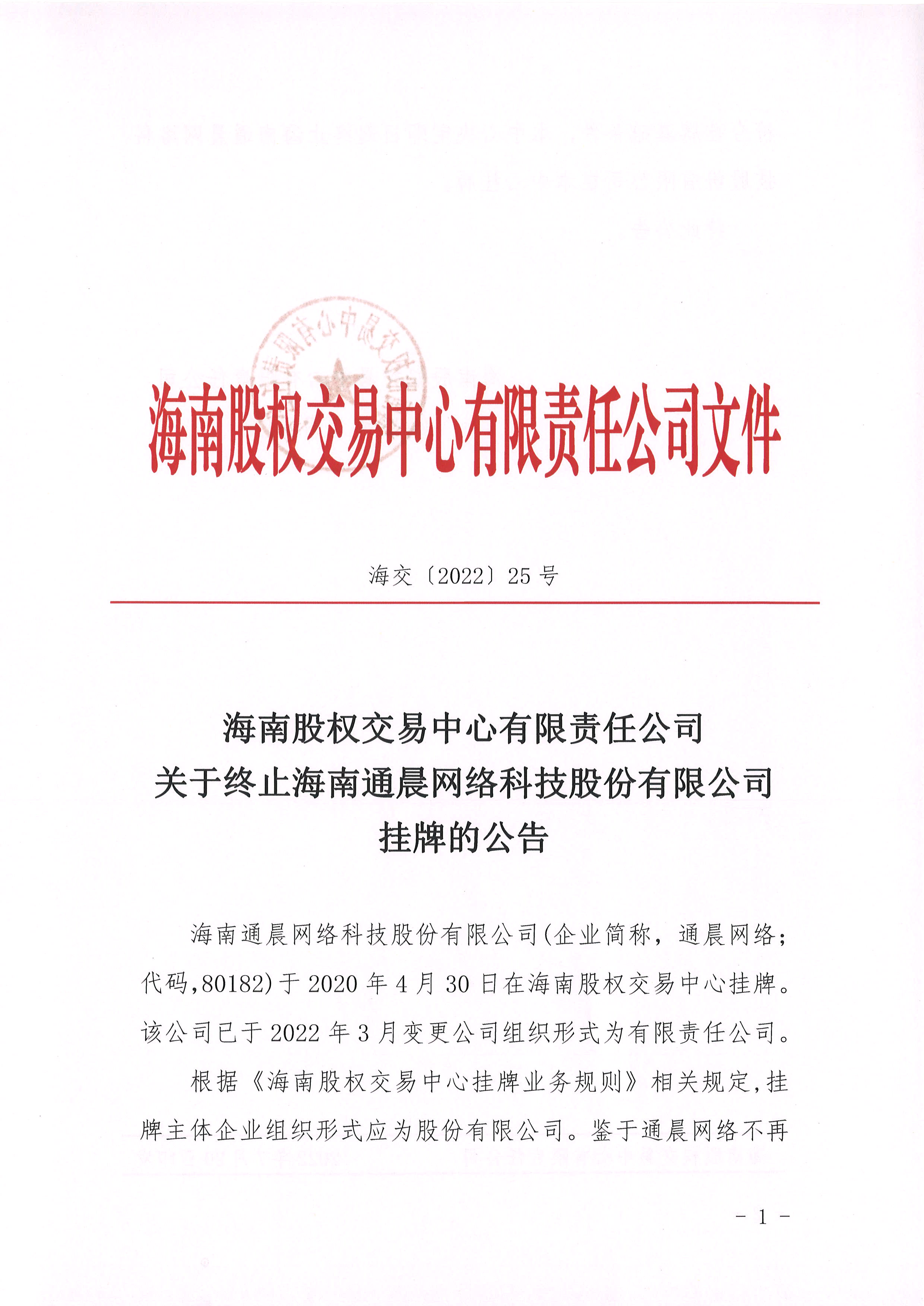 海南股權(quán)交易中心有限責(zé)任公司關(guān)于終止海南通晨網(wǎng)絡(luò)科技股份有限公司掛牌的公告