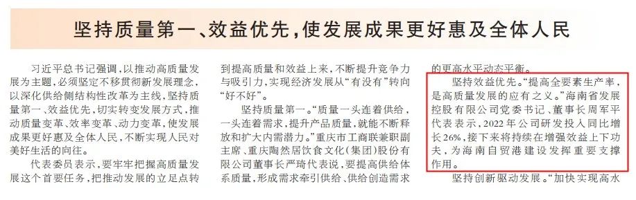 “提高全要素生產(chǎn)率,是高質(zhì)量發(fā)展的應(yīng)有之義?!?/span>海南省發(fā)展控股有限公司黨委書記、董事長周軍平代表表示,2022年公司研發(fā)投入同比增長26%,接下來將持續(xù)在增強(qiáng)效益上下功夫,為海南自貿(mào)港建設(shè)發(fā)揮重要支撐作用。