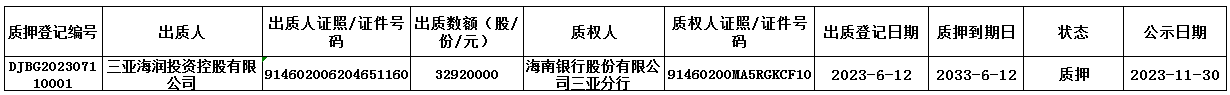海南海潤珍珠股份有限公司(企業(yè)代碼:993883)股東三亞海潤投資控股有限公司于2023年7月11日在我中心辦理了股權(quán)質(zhì)押登記業(yè)務(wù),具體情況如下: