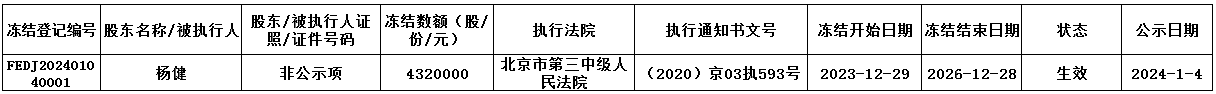 依據北京市第三中級人民法院《協(xié)助執(zhí)行通知書》[(2020)京03執(zhí)593號],我中心為海南臨高農村商業(yè)銀行股份有限公司(企業(yè)代碼:893508)股東楊健辦理股權凍結登記,具體情況如下:
