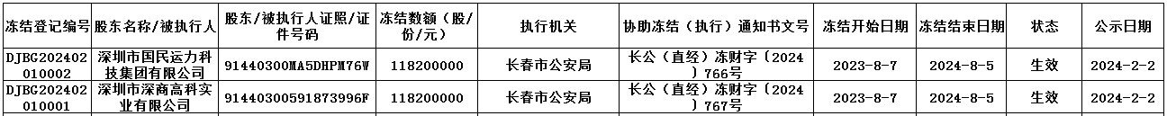 依據(jù)長春市公安局《協(xié)助凍結(jié)財產(chǎn)通知書》[長公(直經(jīng))凍財字〔2024〕766號]、[長公(直經(jīng))凍財字〔2024〕767號],我中心為??诼?lián)合農(nóng)村商業(yè)銀行股份有限公司(企業(yè)代碼:893529)股東深圳市國民運力科技集團有限公司、深圳市深商高科實業(yè)有限公司辦理股權(quán)凍結(jié)延期登記,具體情況如下: