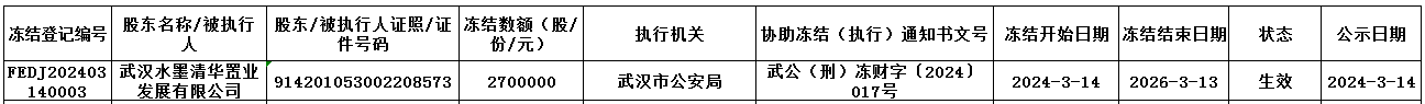 依據(jù)武漢市公安局《協(xié)助凍結(jié)財產(chǎn)通知書》[武公(刑)凍財字〔2024〕017號]文件,我中心為海南瓊中長江村鎮(zhèn)銀行股份有限公司(企業(yè)代碼:893525)股東武漢水墨清華置業(yè)發(fā)展有限公司辦理股權(quán)凍結(jié)登記,具體情況如下: