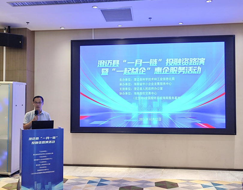 為進一步活躍澄邁縣投融資氛圍,實現(xiàn)企業(yè)與資本的高效聯(lián)合,10月22日,澄邁縣“一月一鏈”投融資路演暨“一起益企”惠企服務(wù)活動在老城科技新城成功舉辦。本次活動由澄邁縣科學技術(shù)和工業(yè)信息化局主辦、海南省中小企業(yè)發(fā)展服務(wù)中心承辦、澄邁縣人民政府辦公室支持、海南股權(quán)交易中心協(xié)辦,相關(guān)投融資機構(gòu)以及中小企業(yè)代表等共計三十余人參加活動。
