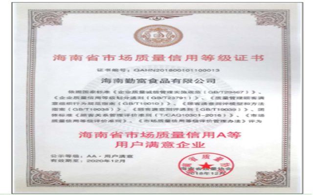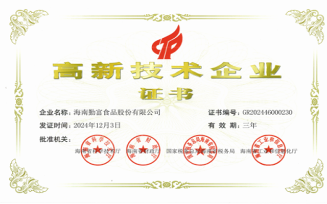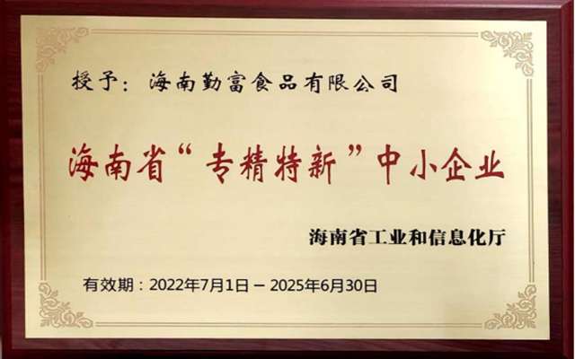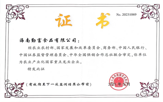 海南勤富食品股份有限公司2018年獲得海南省科技產(chǎn)業(yè)十大影響力領(lǐng)軍企業(yè);連續(xù)獲得海南省第七屆、第八屆、第九屆優(yōu)秀企業(yè);連續(xù)獲得海南省第五屆、第六屆、第七屆杰出民營企業(yè);2019年獲得文昌市脫貧攻堅工作先進單位。